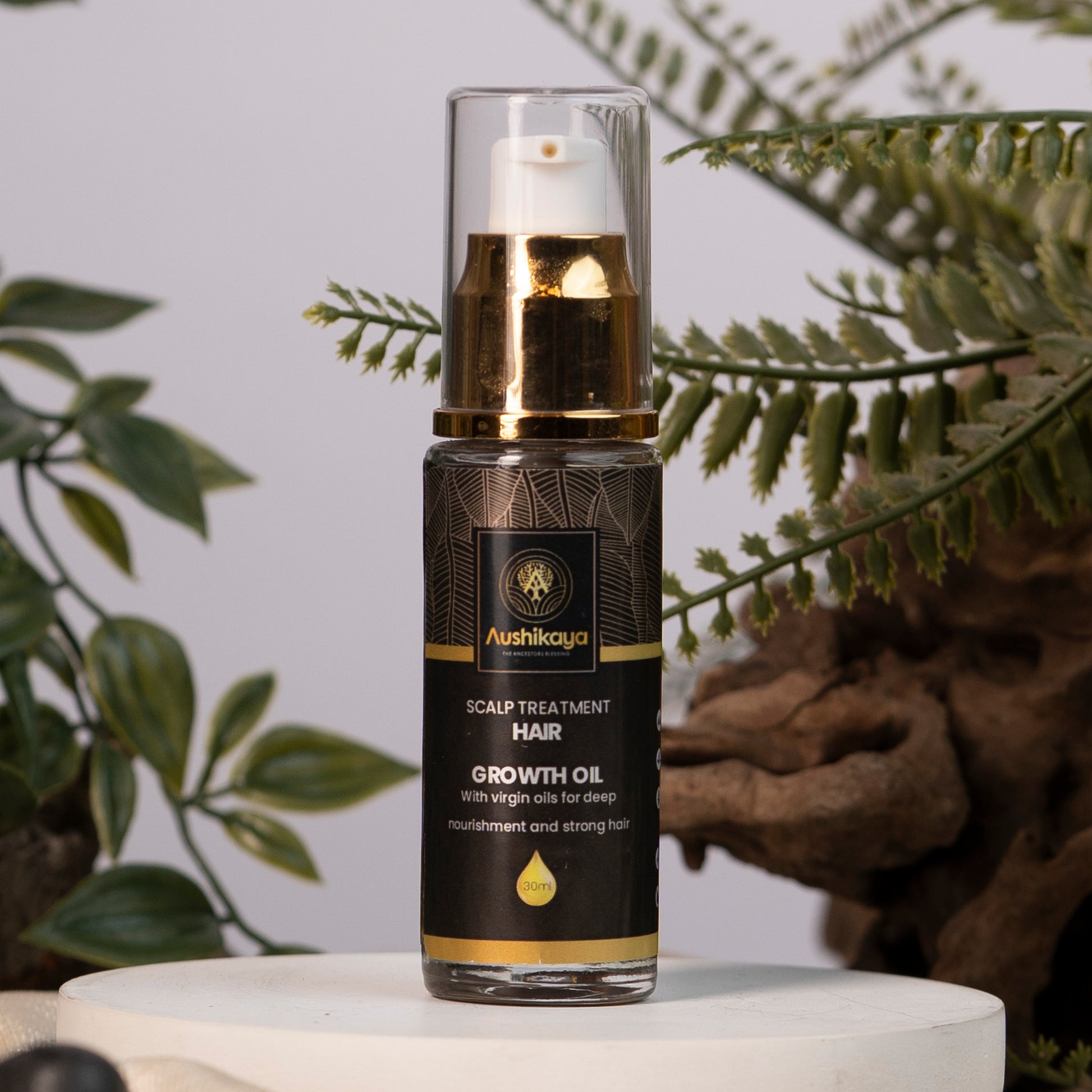 Ayurvedic scalp-nourishing hair growth serum enriched with herbal goodness, strengthens roots, stimulates natural growth, restores balance, adds vitality, and leaves hair strong, shiny, and beautifully healthy.